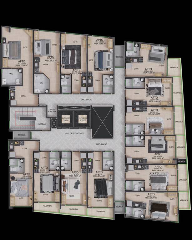 Projeto compacto (22-35 m²) para quem busca baixo custo de entrada e potencial de rendimento com aluguel ou temporada.
